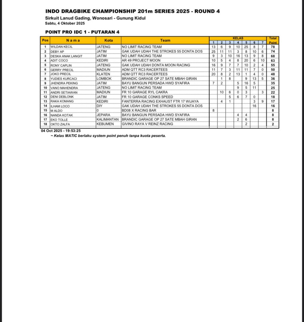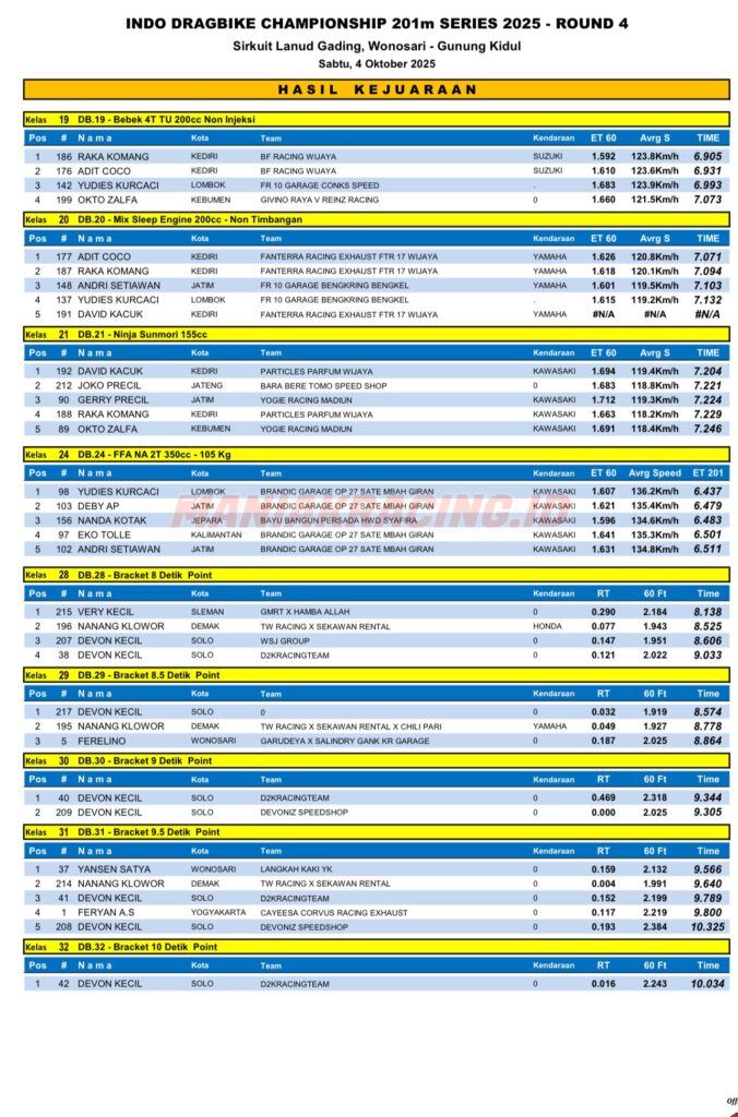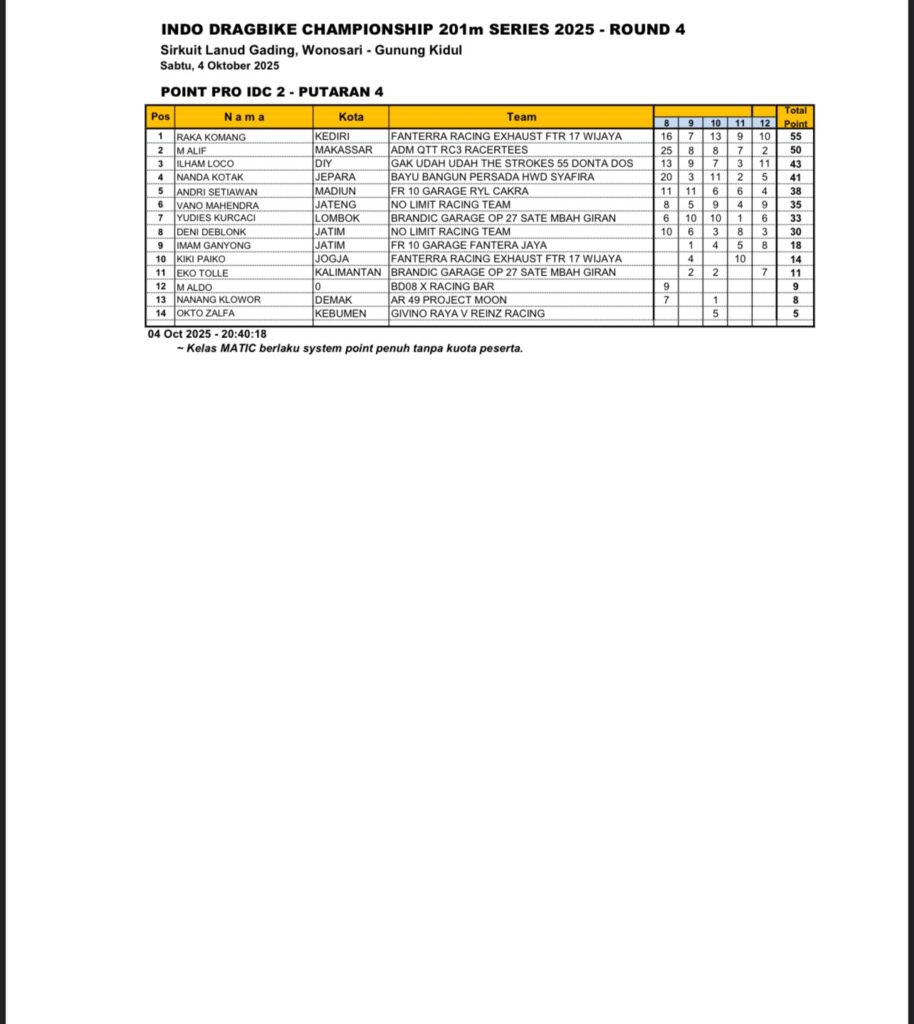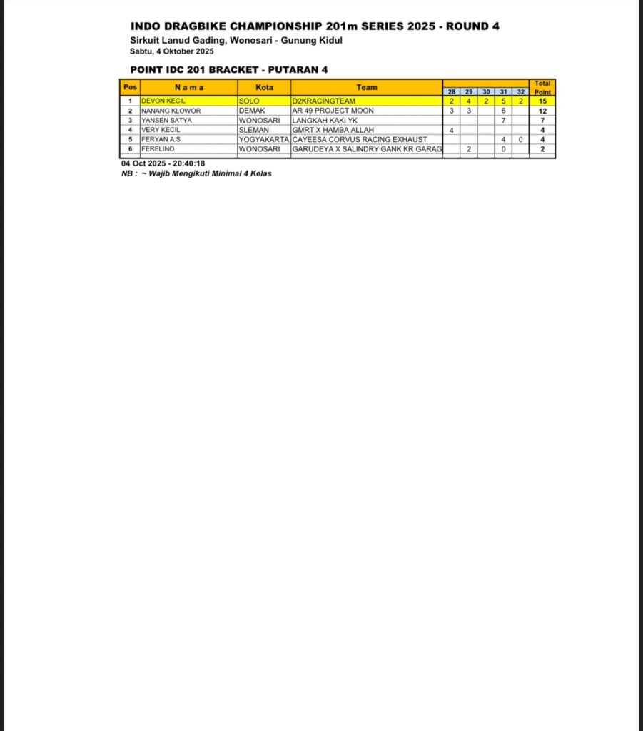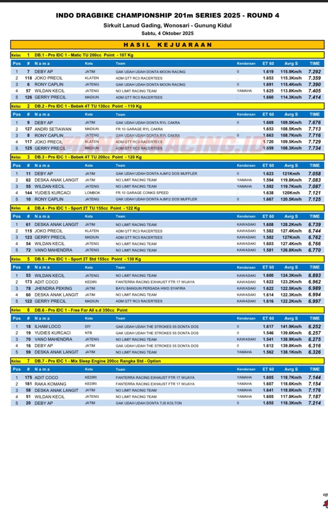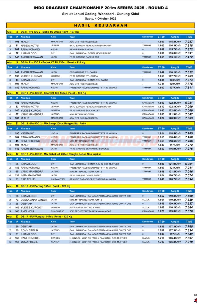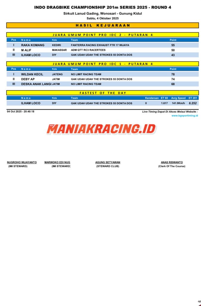 DragbikeHasil BalapNasional Berikut Hasil Event Idc Seri 4 | Sabtu 4 Oktober 2025 Jogja October 5, 2025 maniakracing.id Berikut adalah hasil event Drag bike idc putaran 4 sabtu 4 oktober 2025 .