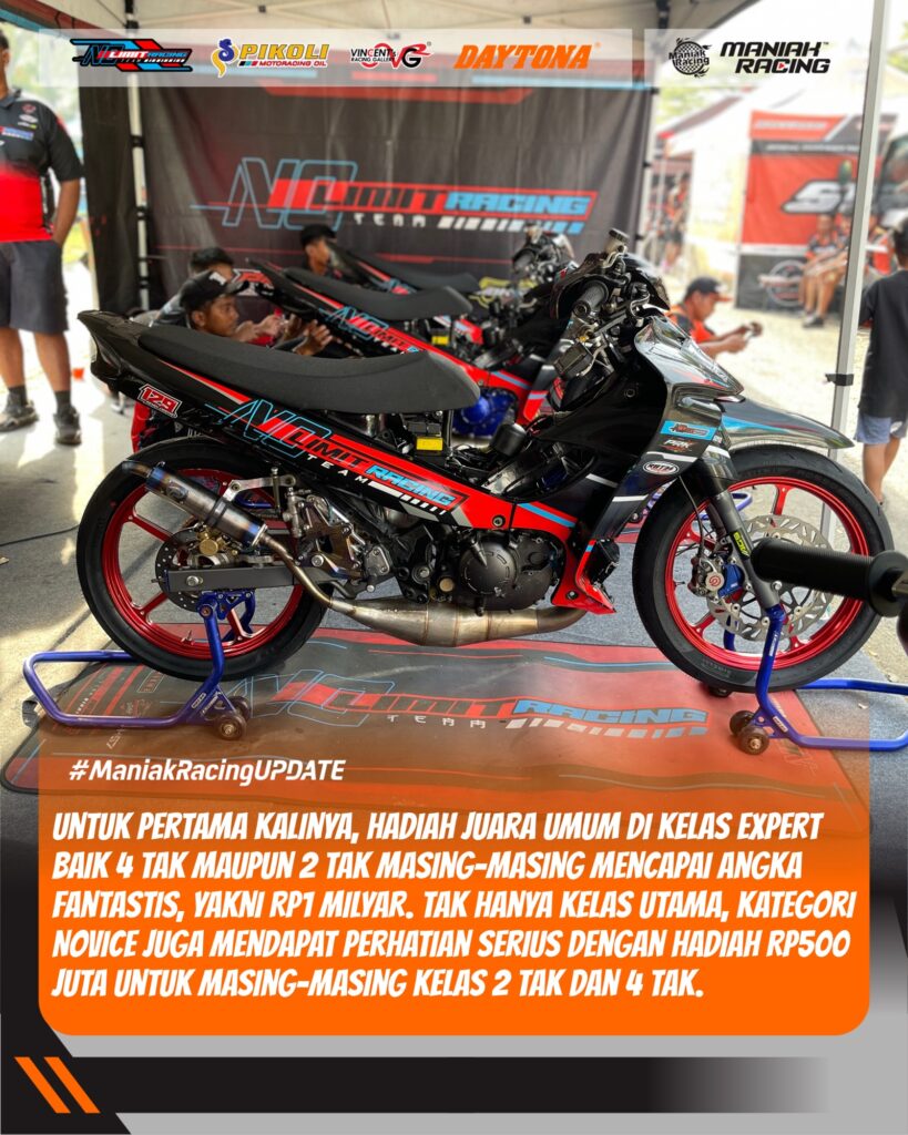 Untuk pertama kalinya, hadiah juara umum di kelas Expert baik 4 Tak maupun 2 Tak masing-masing mencapai angka fantastis, yakni Rp1 Milyar. Tak hanya kelas utama, kategori Novice juga mendapat perhatian serius dengan hadiah Rp500 Juta untuk masing-masing kelas 2 Tak dan 4 Tak.