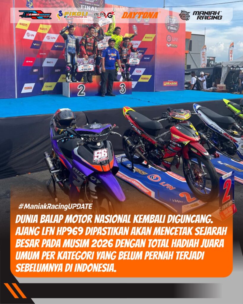 Dunia balap motor nasional kembali diguncang. Ajang LFN HP969 dipastikan akan mencetak sejarah besar pada musim 2026 dengan total hadiah juara umum per kategori yang belum pernah terjadi sebelumnya di Indonesia.
