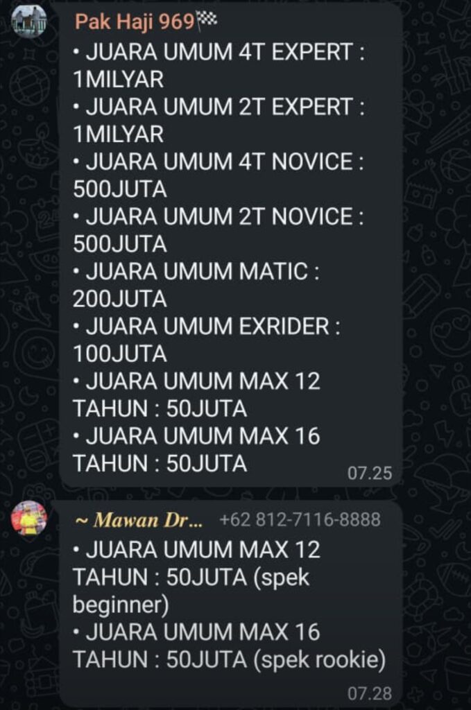 Dan juga ada hadiah juara umum di kelas lainya seperti juara umum kelas matic Rp.200.000.000 , Juara umum kelas exrider Rp.100.000.000, juara umum max 12 tahun ( beginner ) Rp.50.000.000 dan juara umum Max 16 tahun ( rookie ) Rp.50.000.000.