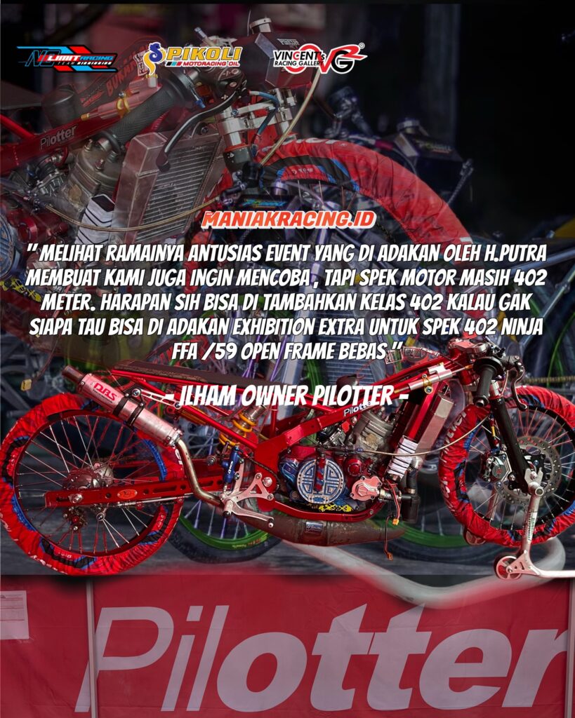 Menariknya, dua Ninja andalan Team Pilotter tersebut merupakan garapan Painoel Racing Jawa Timur.Adapun dua motor yang disiapkan adalah Ninja 59 Open Frame Bebas dan Ninja FFA 2 Tak.