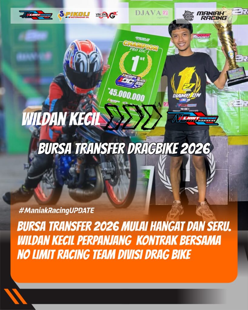 Bursa transfer dragbike jelang musim 2026 mulai menunjukkan tensinya. Sejumlah tim mulai mengamankan rider andalan mereka, salah satunya datang dari Team No Limit asal Medan yang resmi memastikan memperpanjang kontrak pembalap andalannya, Wildan Kecil.