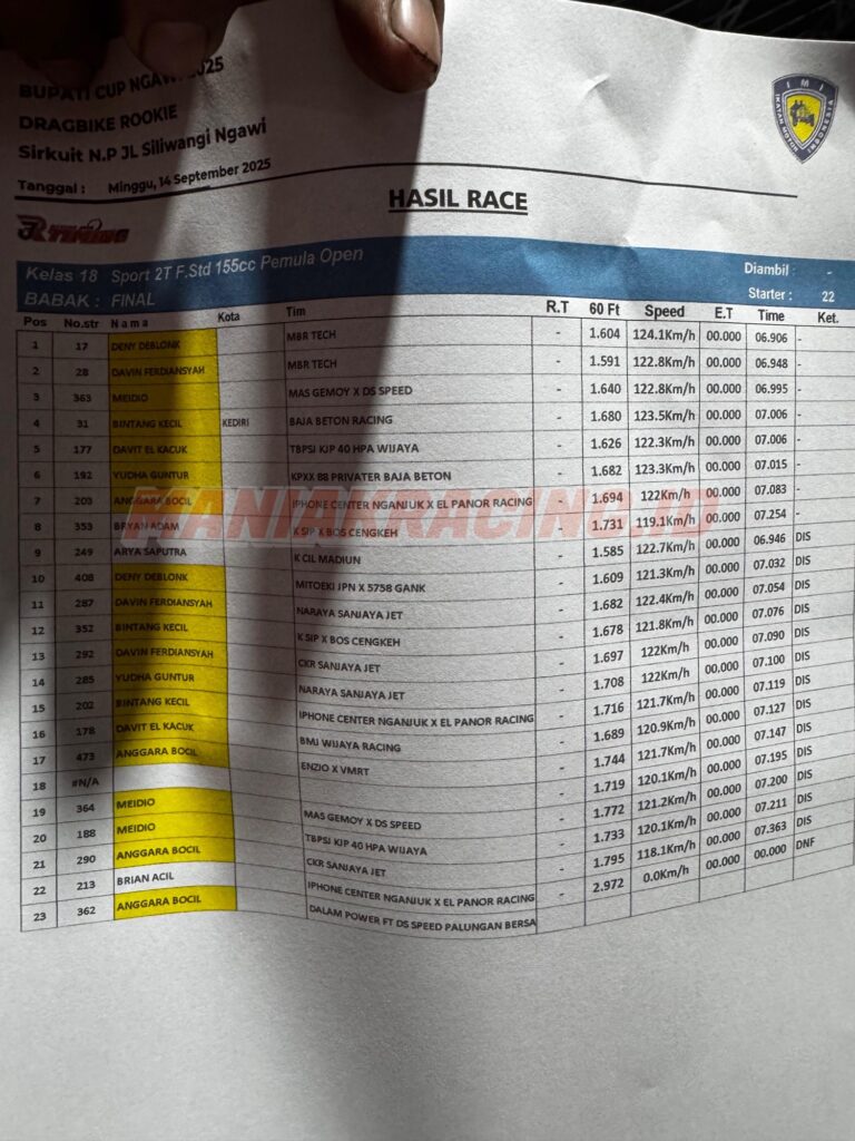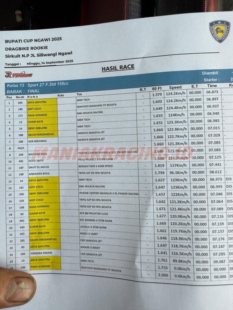 Event dragbike ngawi 14 september 2025 berjalan seru dan ketat , banyak peserta hadir meramaikan event yang berlokasi di Jl. siliwangi ngawi dalam rangkap piala bupati . Di event kali ini ada yang mendominasi di dua kelas ninja frame std 155 cc, motor bikinan conks speed malang kali ini begitu mendominasi.