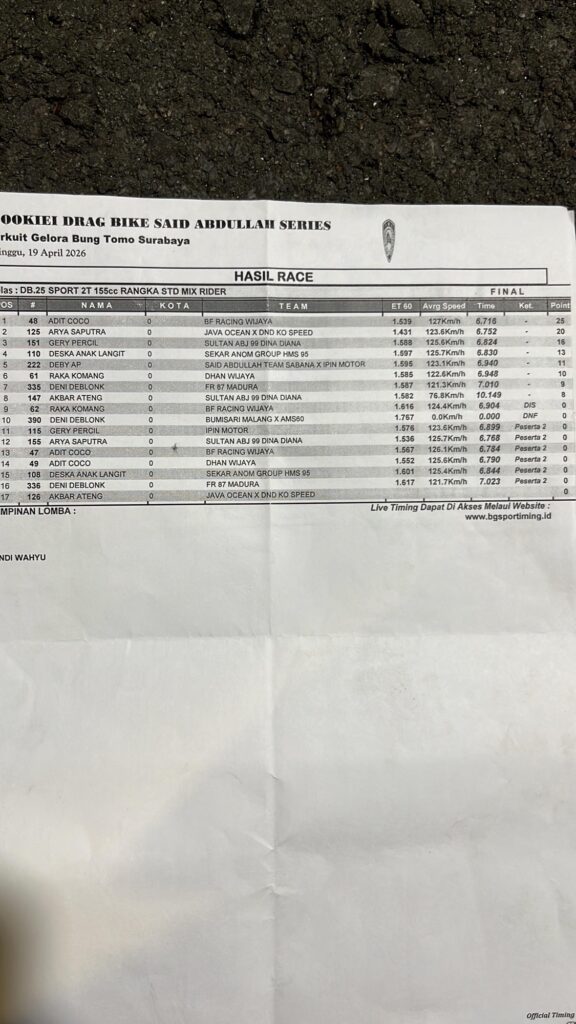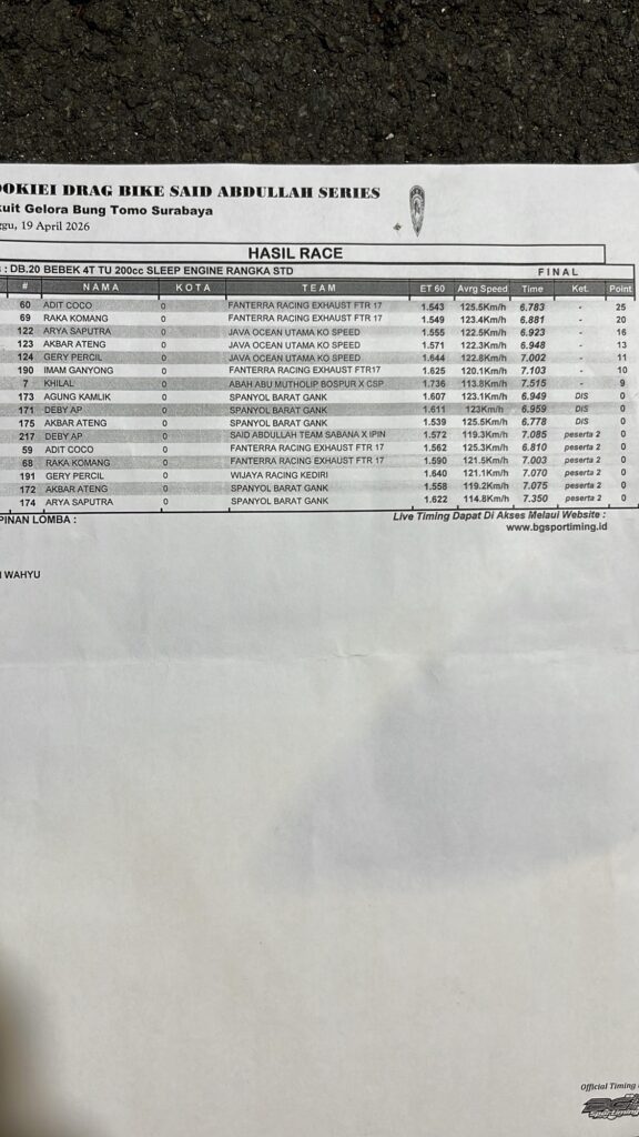 Performa luar biasa ditunjukkan oleh Wijaya Racing dalam gelaran drag bike di GBT Surabaya. Dua andalan mereka, yaitu Sleep Engine 200 dan Ninja frame standar, sama-sama tampil impresif dengan torehan waktu yang makin tajam.