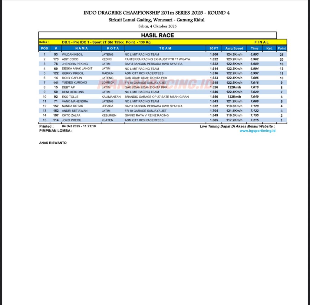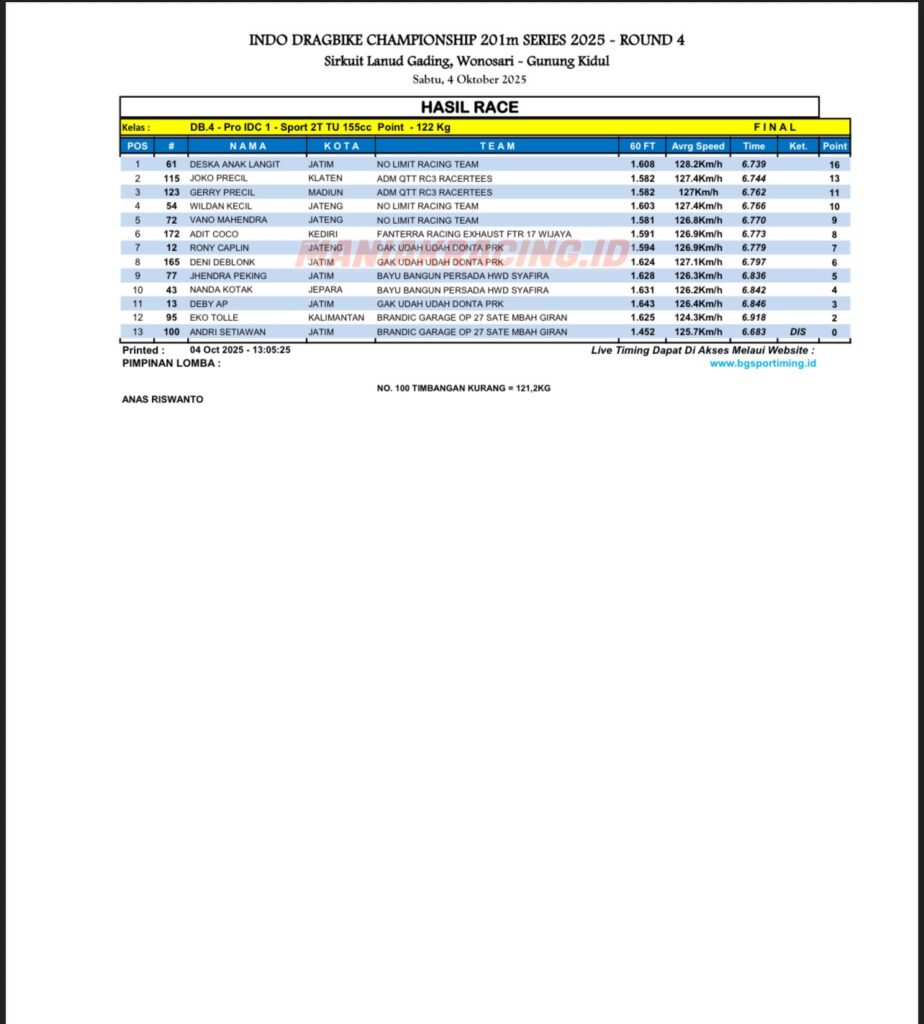 Event idc putaran ke empat di 4 oktober 2025 kembali jadi pembuktian ninja garapan Setyoko pencenk di ajang 201 meter, hari ini dua ninja prk kembali mendominasi di dua kelas. Wildan kecil berhasil juara 1 kelas ninja std dengan catatan time fantastis 6.8 detik dan di kelas ninja tune up 155 ada deska anak langit dengan catatan 6.7 detik berhasil finish ke satu.