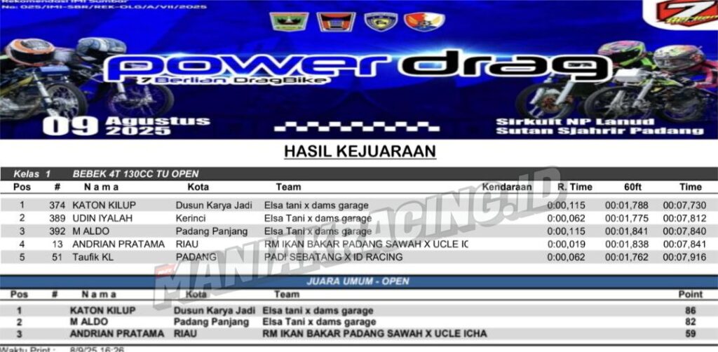 Gelaran POWERDRAG 7 Berlian Dragbike yang berlangsung pada 9 Agustus 2025 di Sirkuit N.P Lanud Sutan Sjahrir, Padang menjadi panggung unjuk gigi tim Elsa Tani X Dams Garage. Performa luar biasa mereka langsung mencuri perhatian penonton dan pesaing-pesaingnya, membuktikan diri sebagai salah satu tim paling solid dan berbahaya di lintasan.