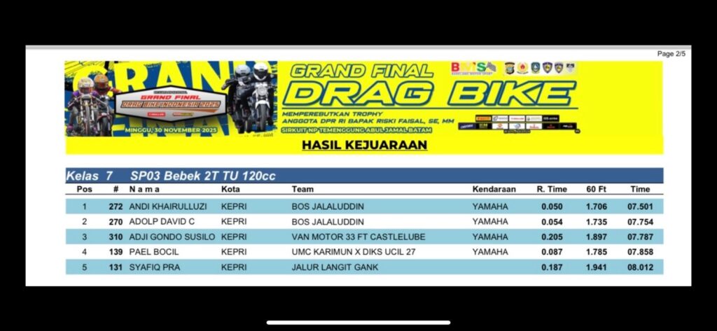 Dengan hasil sapu bersih ini, Team BOS Jalaludin resmi menjadi pusat perhatian dan membuktikan diri sebagai penguasa Bebek 2T TU 120 cc di Batam.