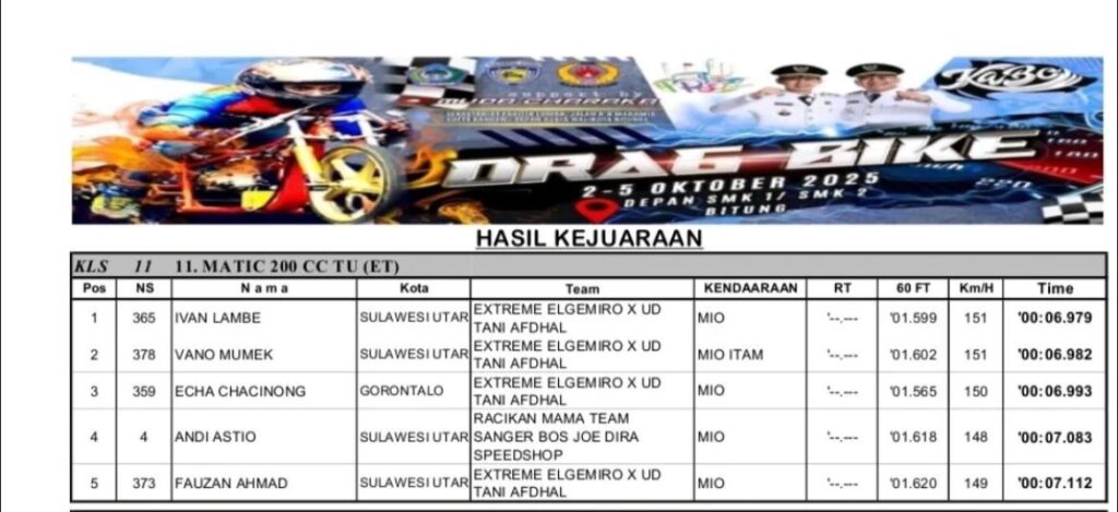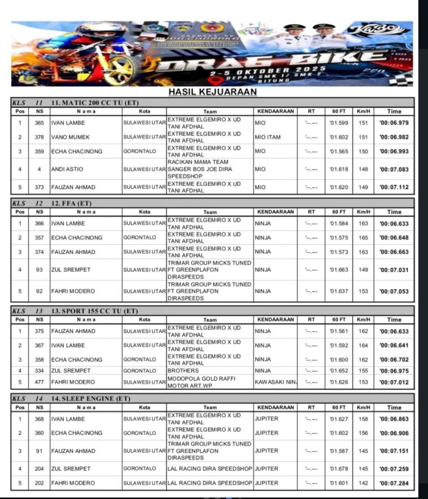 Perkembangan balap di sulawesi semakin bergairah saja akhir akhir ini, gebrakan team asal sulawesi mulai memanas dan banyak keluarkan strategi team yanh menarik di bahas. Salah satu team yang mencolok adalah team Ud. Tani Afdhal yang kemarin di DB. Bitung berhasil cetak best time fantastis di kelas matic 200 tune up dengan catatan 6.979 detik.