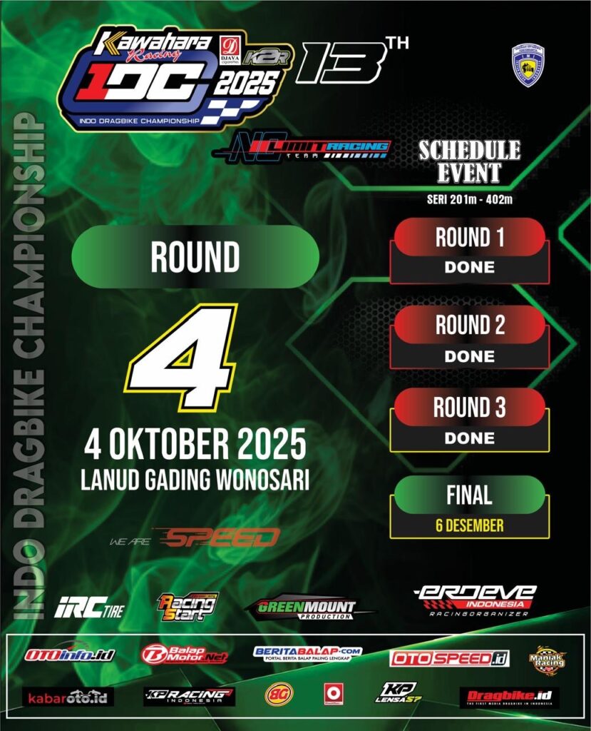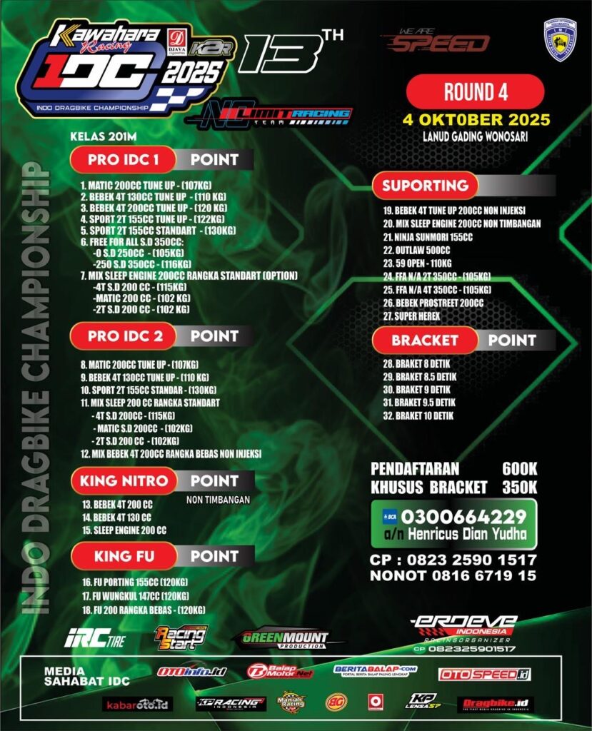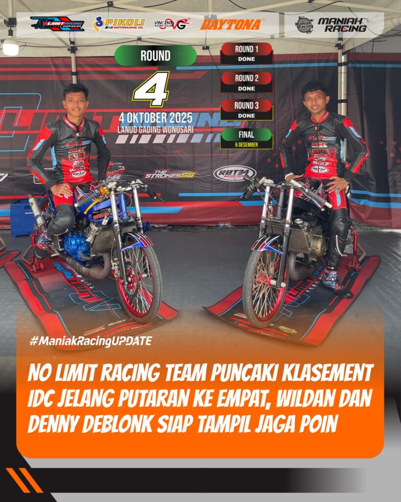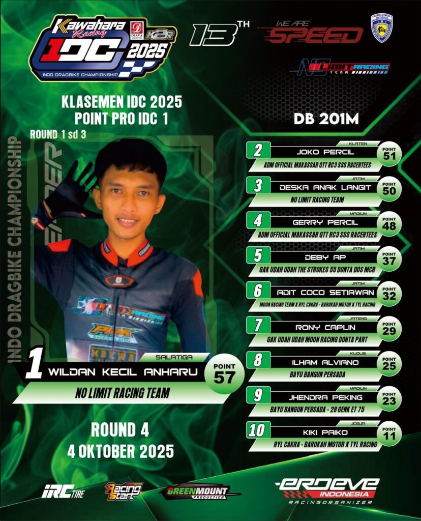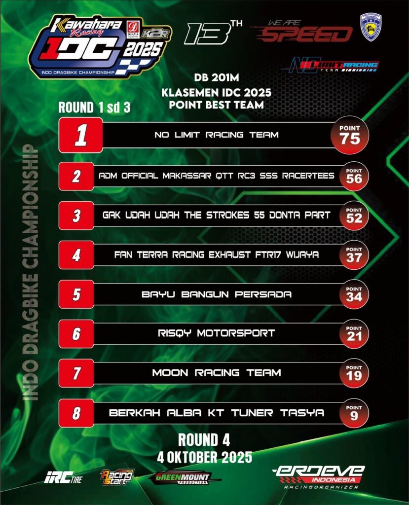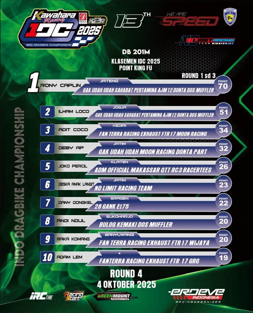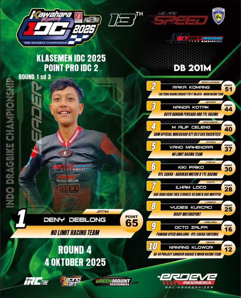 Jelang idc round 4 di jogja tanggal 4 oktober 2025 klasement point seru dan ketat. Team no limit berhasil puncaki klasement point di open dan pemula lewat wildan kecil dan deny deblonk. Hadapi putaran ke empat ini kedua joki di wajibkan bisa menjaga point di semua kelas poin karena kandidat lain di bawahnya juga point nya terpaut tipis.
