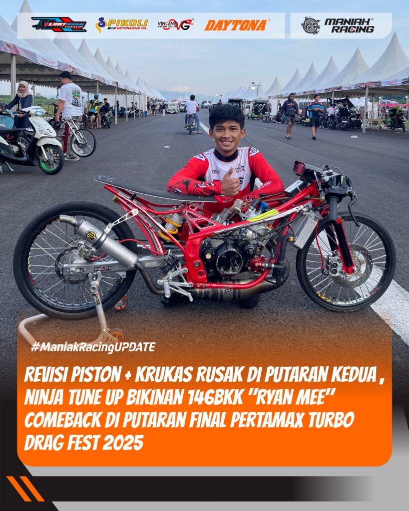Ryan mee kembali buktikan garapan nya bukan kebetulan bisa juara di event besar pertamax turbo drag fest 2025, revisi bagian piston dan kruk as yang rusak di putaran kedua akhirnya motor team yukido ini berhasil comeback di putaran final.