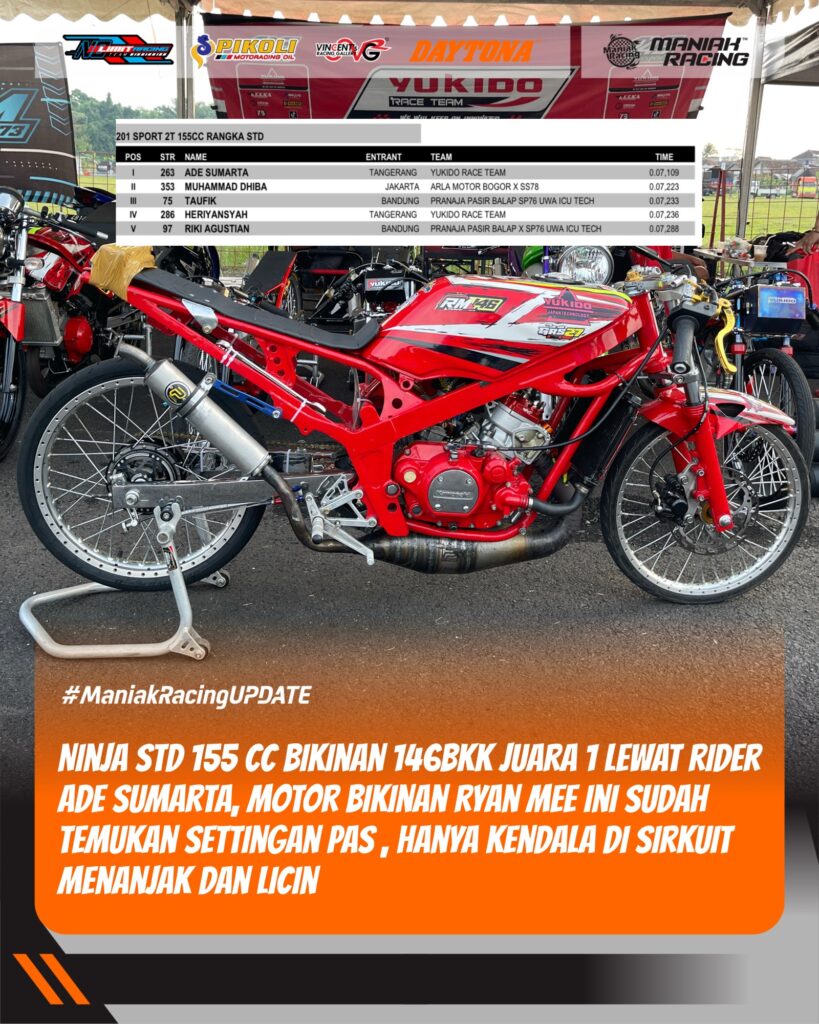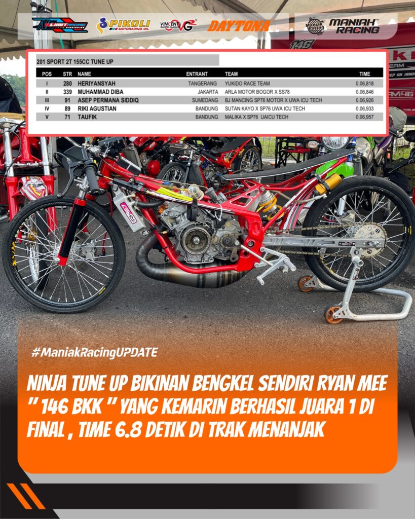 Ninja bikinan ryan mee sendiri ini kembali juara 1 di putaran final pertamax turbo drag fest 13 september 2025, bengkel 146Bkk di putaran ketiga ini melakukan perbaikan dari putaran kedua kemarin dimana motor sempar alami pecah piston dan rusak di bagian teflon kruk as, untuk spek nya sendiri masih sama seperti sebelumnya kata pembalap yang juga menjadi mekanik dari team nya ini.