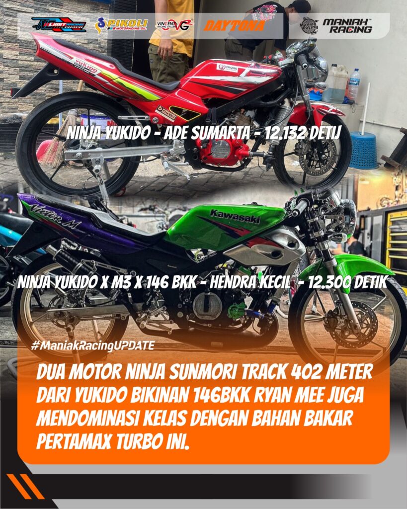 Tidak ketinggalan di kelas ninja sunmori bahan bakar pertamax turbo di jarak 402 meter juga motor dari 146 bkk berhasil juara satu dan dua , kedua motor ini juga merupakan karya ryan mee sendiri.