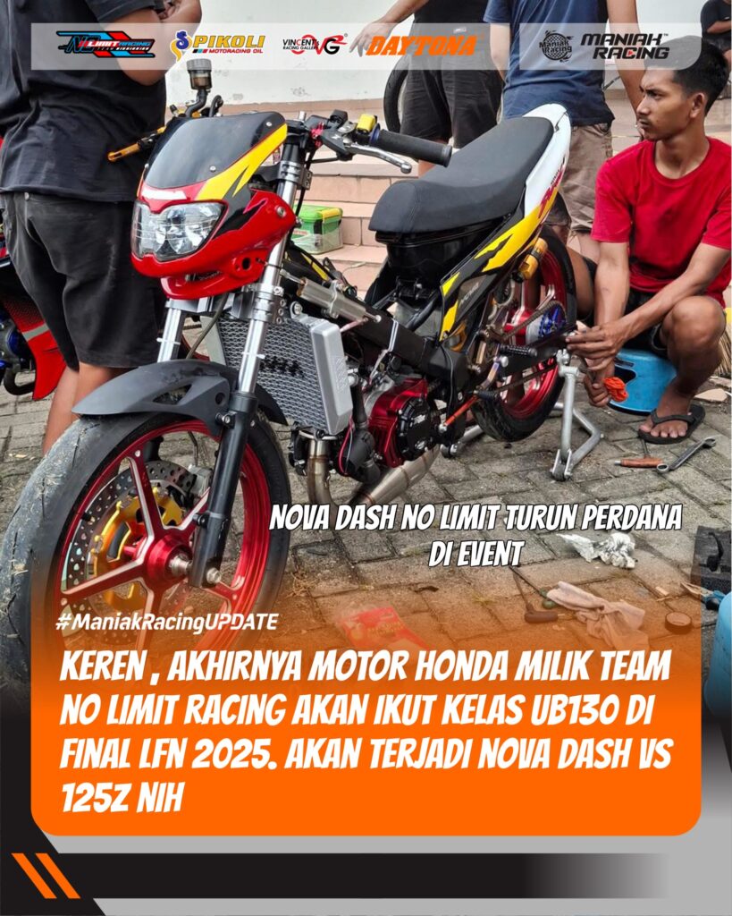 Gelaran Final LFN 2025 dipastikan semakin sengit setelah Team No Limit Racing mengumumkan keikutsertaannya dengan line-up dan persiapan yang berbeda dari seri – seri sebelumnya. Tim tersebut resmi menghadirkan motor Honda Nova Dash sebagai senjata baru menemani 125z mereka di kelas ub130, dan mempercayakan kendali nova dash di lintasan kepada pembalap nasional Andy Gilang, salah satu rider yang dikenal berpengalaman dalam berbagai ajang balap, baik nasional maupun internasional.