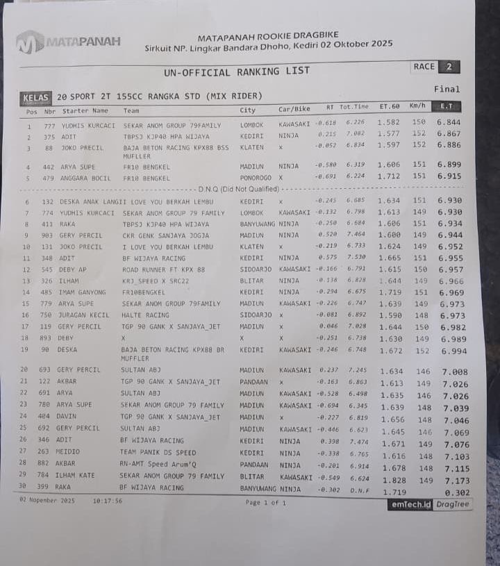Event matapanah kali ini berlokasi di Sirkuit NP. Lingkar Bandara Dhoho Kediri 2 oktober 2025. Berikut adalah hasilnya di kelas ninja frame std mix rider